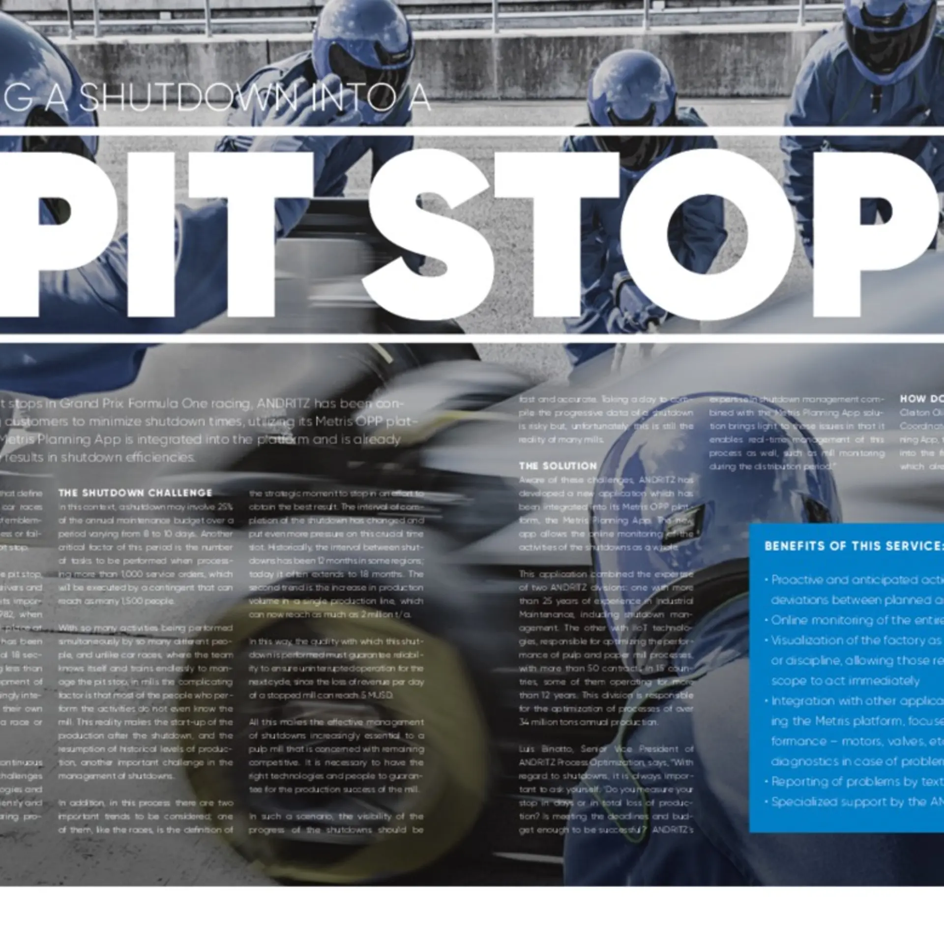 Just like super-fast pit stops in Grand Prix Formula One racing, ANDRITZ has been concentrating on helping customers to minimize shutdown times, utilizing its Metris OPP platform. The dedicated Metris Planning App is integrated into the platform and is already achieving remarkable results in shutdown efficiencies.