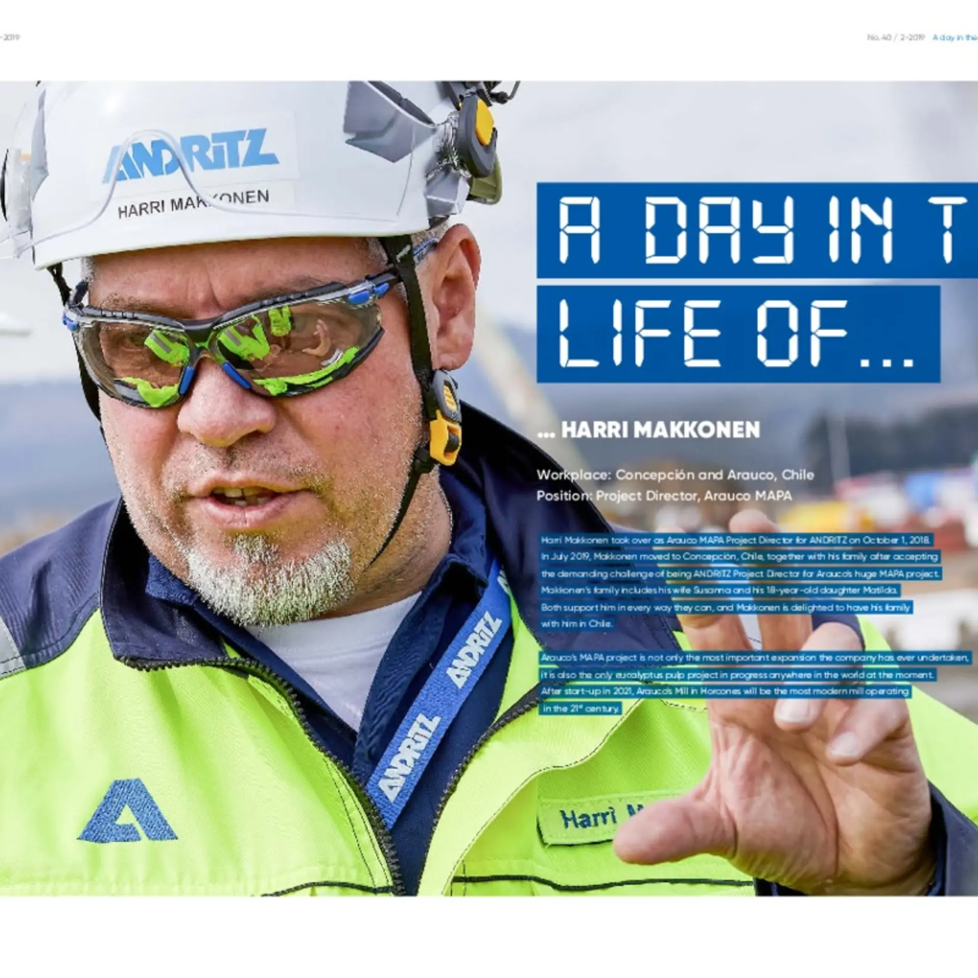 Harri Makkonen took over as Arauco MAPA Project Director for ANDRITZ on October 1, 2018. In July 2019, Makkonen moved to Concepción, Chile, together with his family after accepting the demanding challenge of being ANDRITZ Project Director for Arauco’s huge MAPA project. Makkonen’s family includes his wife Susanna and his 18-year-old daughter Matilda. Both support him in every way they can, and Makkonen is delighted to have his family with him in Chile.