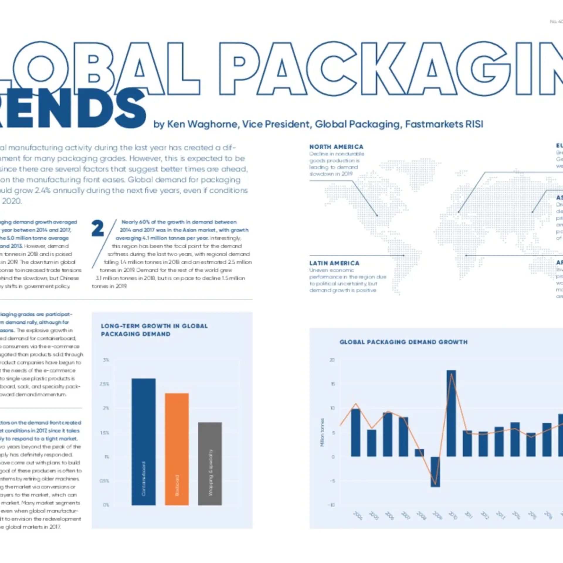 Global paper packaging demand growth averaged 6.9 million tonnes per year between 2014 and 2017, up substantially from the 5.0 million tonne average increase between 2008 and 2013. However, demand growth slowed to 1.7 million tonnes in 2018 and is poised to decline 4.0 million tonnes in 2019. The downturn in global manufacturing activity in response to increased trade tensions has been the biggest factor behind the slowdown, but Chinese demand is also being affected by shifts in government policy.