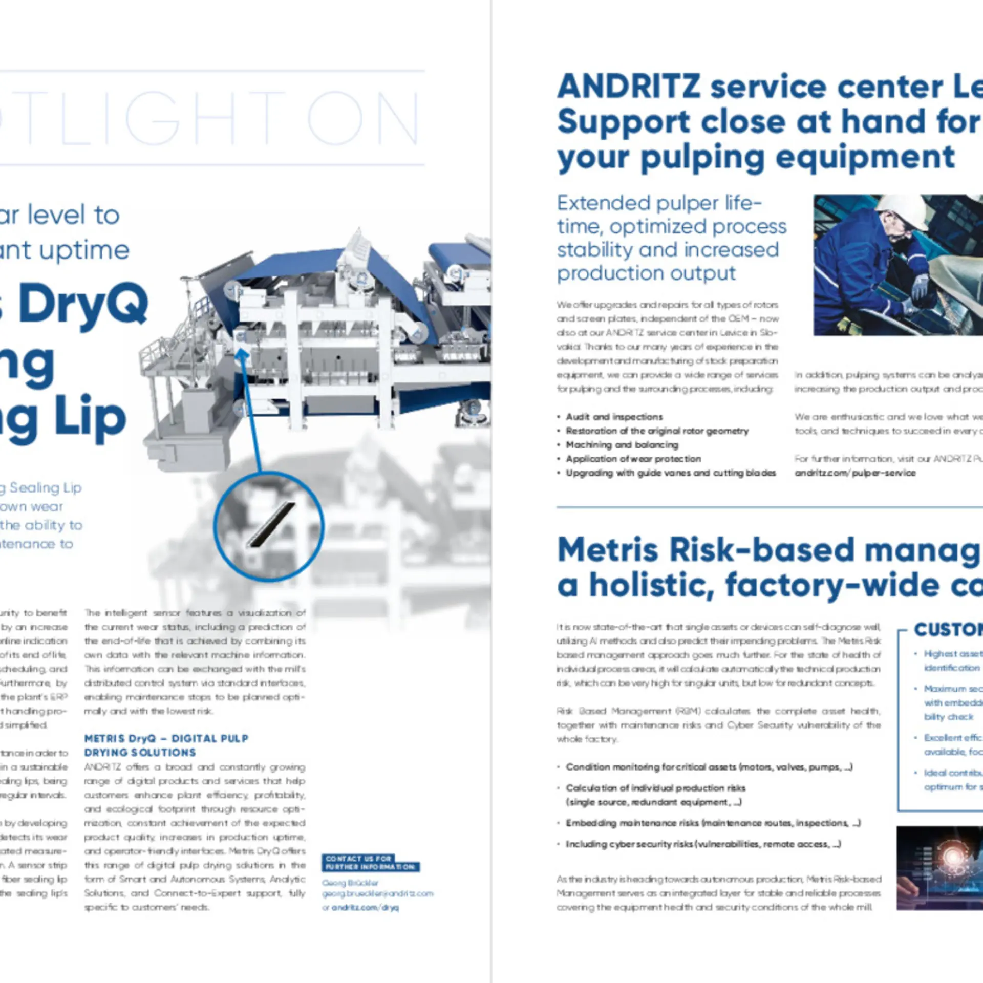 ANDRITZ offers a broad and constantly growing range of digital products and services that help customers enhance plant efficiency, profitability, and ecological footprint through resource optimization, constant achievement of the expected product quality, increases in production uptime, and operator-friendly interfaces. Metris DryQ offers this range of digital pulp drying solutions in the form of Smart and Autonomous Systems, Analytic Solutions, and Connect-to-Expert support, fully specific to the customer needs.