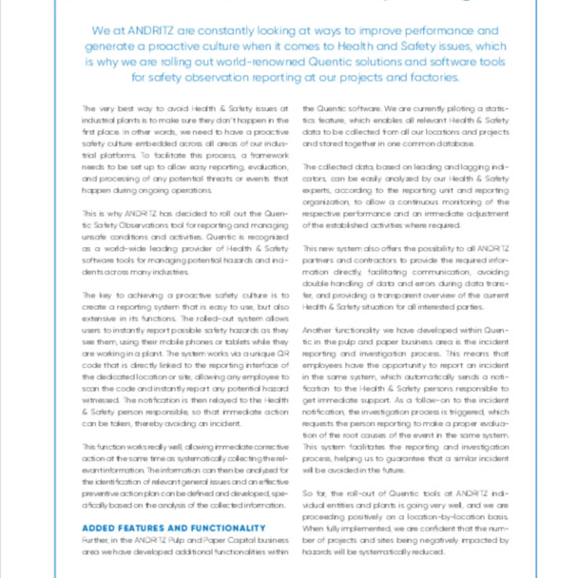We at ANDRITZ are constantly looking at ways to improve performance and generate a proactive culture when it comes to Health and Safety issues, which is why we are rolling out world-renowned Quentic solutions and software tools for safety observation reporting at our projects and factories.