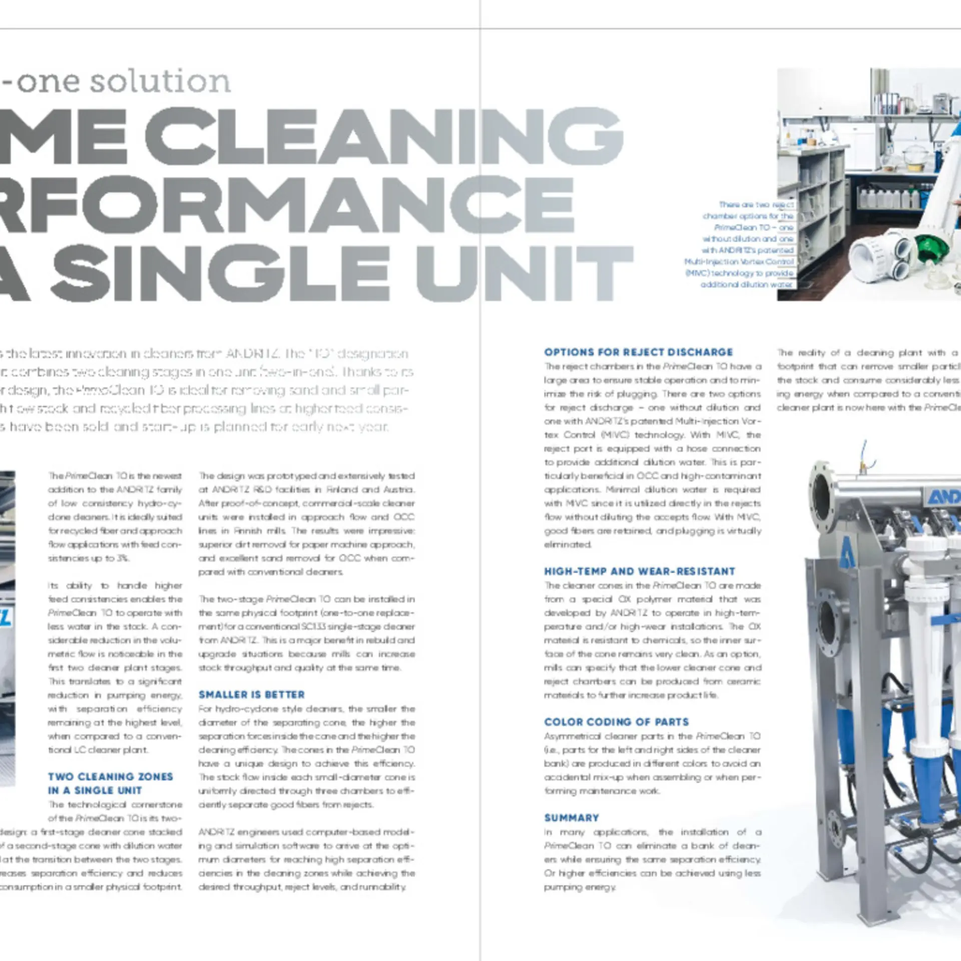 The design was prototyped and extensively tested at ANDRITZ R&D facilities in Finland and Austria. After proof-of-concept, commercial-scale cleaner units were installed in approach flow and OCC lines in Finnish mills. The results were impressive: superior dirt removal for paper machine approach, and excellent sand removal for OCC when compared with conventional cleaners