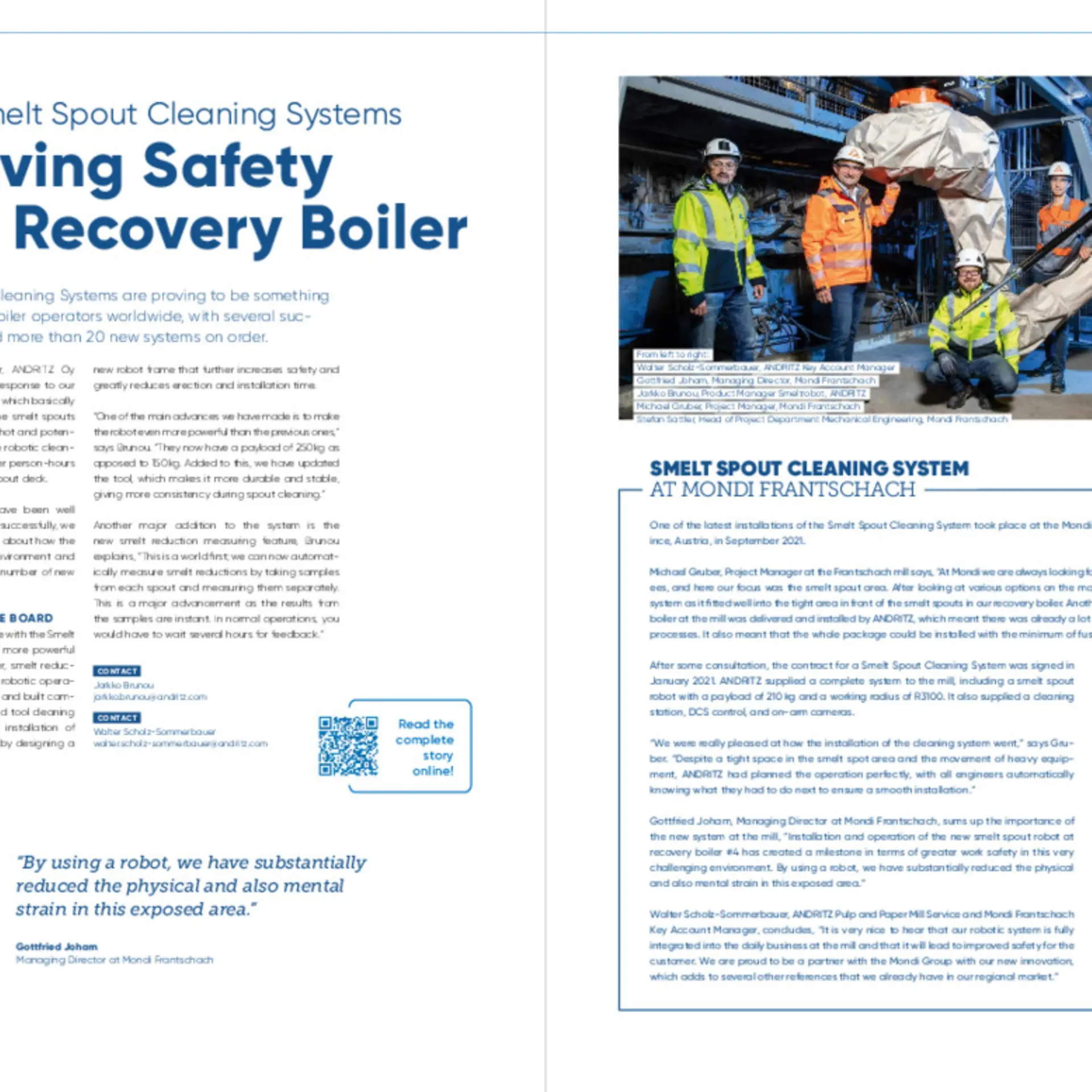 Gottfried Joham, Managing Director at Mondi Frantschach, sums up the importance of the new system at the mill, “Installation and operation of the new smelt spout robot at recovery boiler #4 has created a milestone in terms of greater work safety in this very challenging environment. The robot, which cleans the boiler’s smelt spouts continuously and reliably, ensures that there is a constant flow of smelt, guaranteeing regular boiler operations without our staff having to intervene manually.